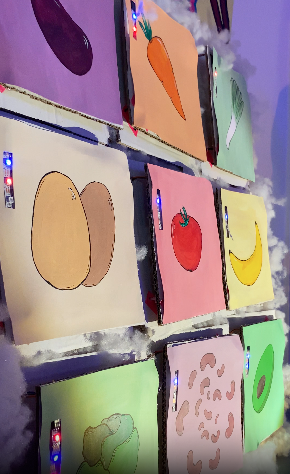 Bon Appetito! is 1v1 arcade game mixing a tic-tac-toe and a knock ‘em down. It is composed of layer of 3x3 pressure plates with 3 LEDs each. Two players battle each other by using kitchen utensils as alternative controller and throwing vegetables onto the board.
