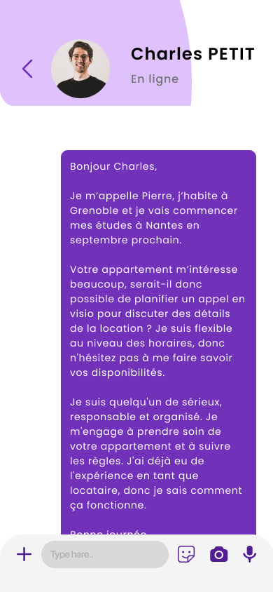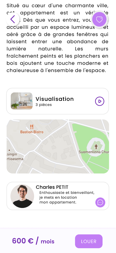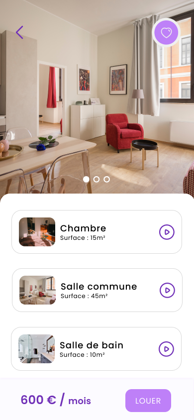 To avoid creating too many elements, I created one card that can be used for various purpose: for the list of favourite housing, for the contact of the landlords, for the videos of the different rooms. By creating one template card we minimise the workload for a possible development of the app.