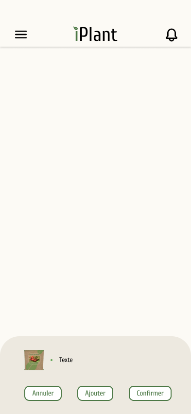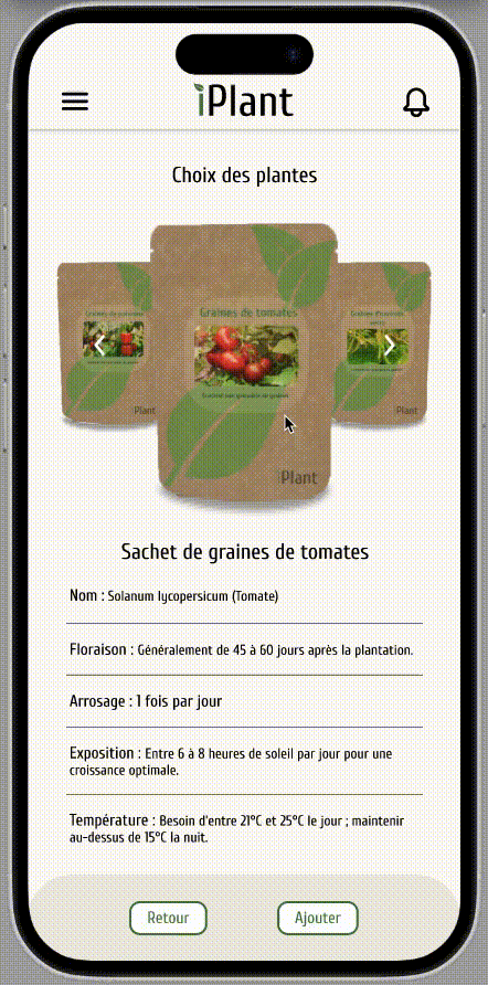To create a strong image of the brand, I designed a navigation bar using the leaf symbol representing iPlant. When selected, the icon will be in the active color to create a contrast with the green, and a leaf in gradient will support the icon.