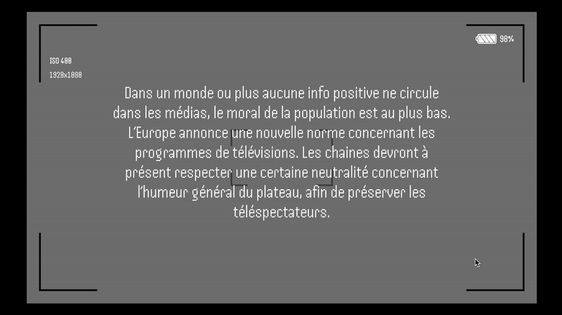 As the player is a cameraman on a TV set, I designed the main interface based on interfaces from real TV set camera. I keep some elements from original interfaces such as the REC, the picture settings and the zoom; with the objective to not overwhelm the player while immersing him enough into becoming a cameraman.