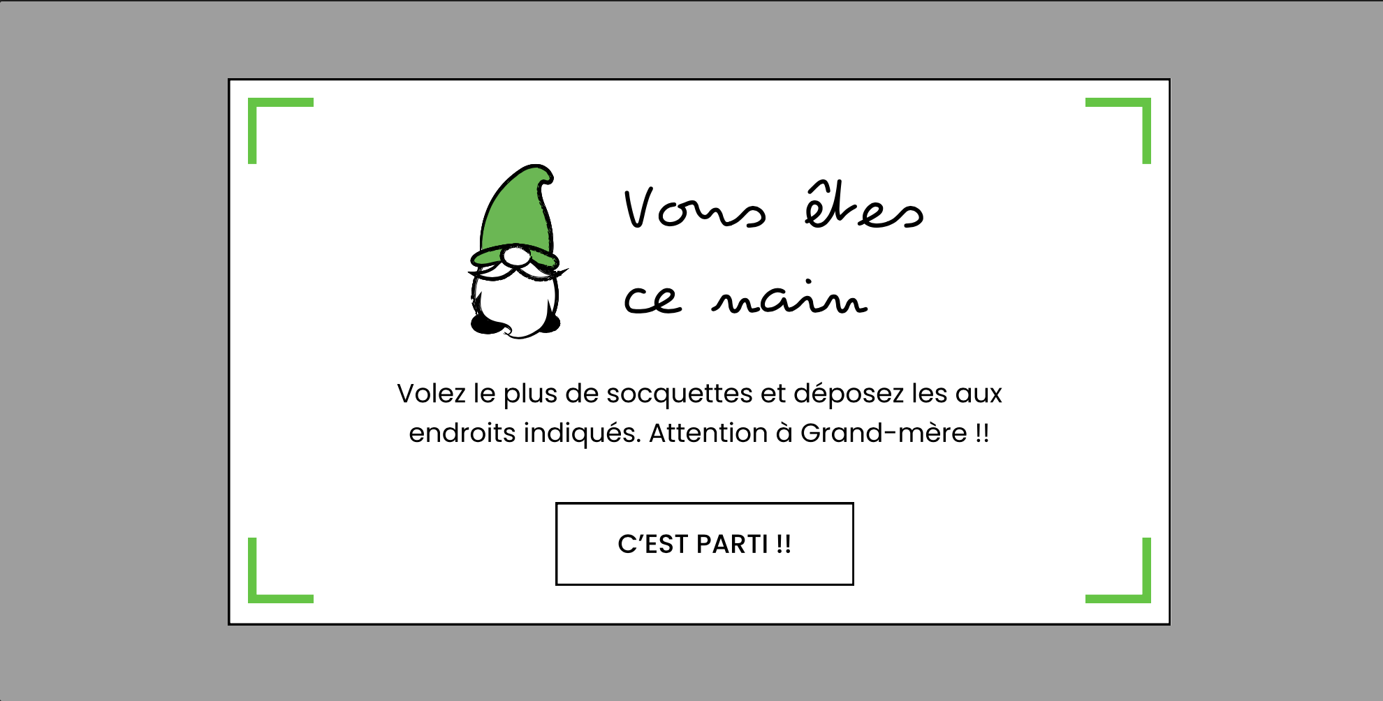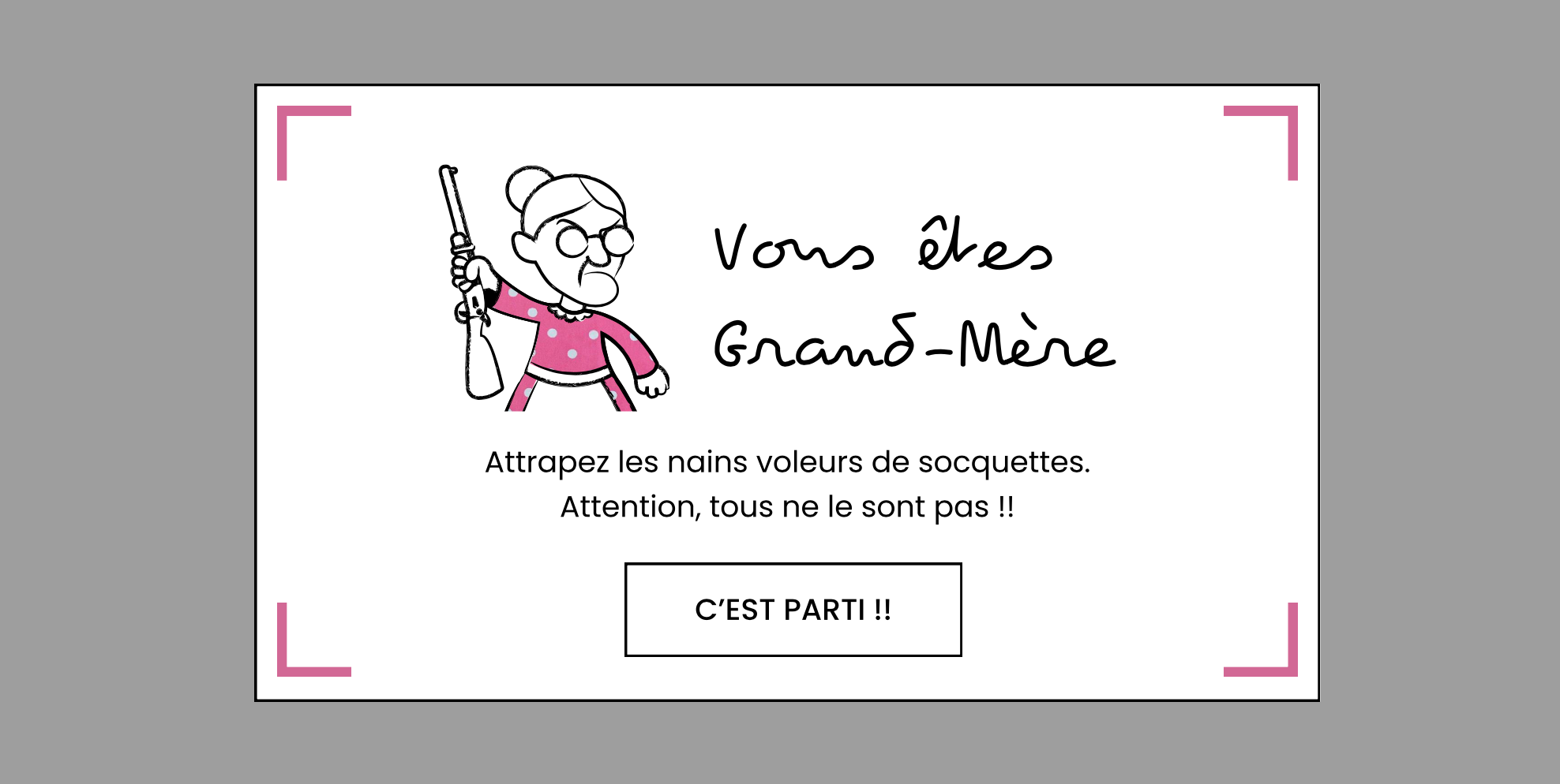 The controller possesses a minimalist interface that adapts easily to every role. A top bar displays the essential information such as the name, the score, and the responsive button. The role of the player is shown by the avatar at the center of directional keys. The action button on the other side allows the Grandma to shoot or the gnome to collect and deliver socks.