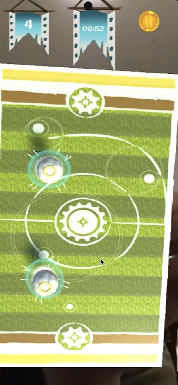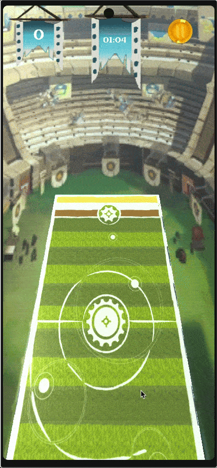 When starting the game, the player arrives on the login interface which serves as a screen title. The name entered will be displayed on the scoreboard at the end if you manage to score enough points. The player then decides whether they want to play in AR or not. The scene without AR is on a fixed view in a Boufball stadium, while being AR set the field wherever the marker is.
