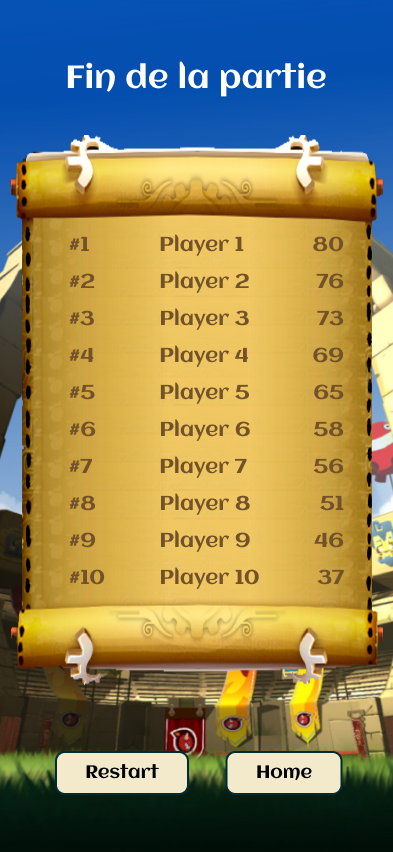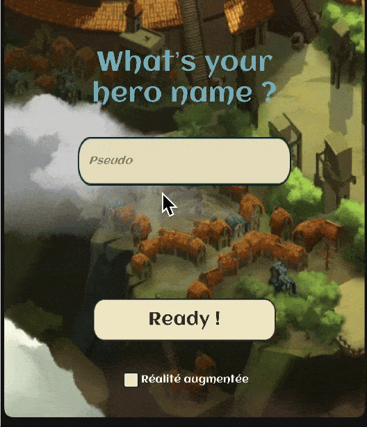 When starting the game, the player arrives on the login interface which serves as a screen title. The name entered will be displayed on the scoreboard at the end if you manage to score enough points. The player then decides whether they want to play in AR or not. The scene without AR is on a fixed view in a Boufball stadium, while being AR set the field wherever the marker is.